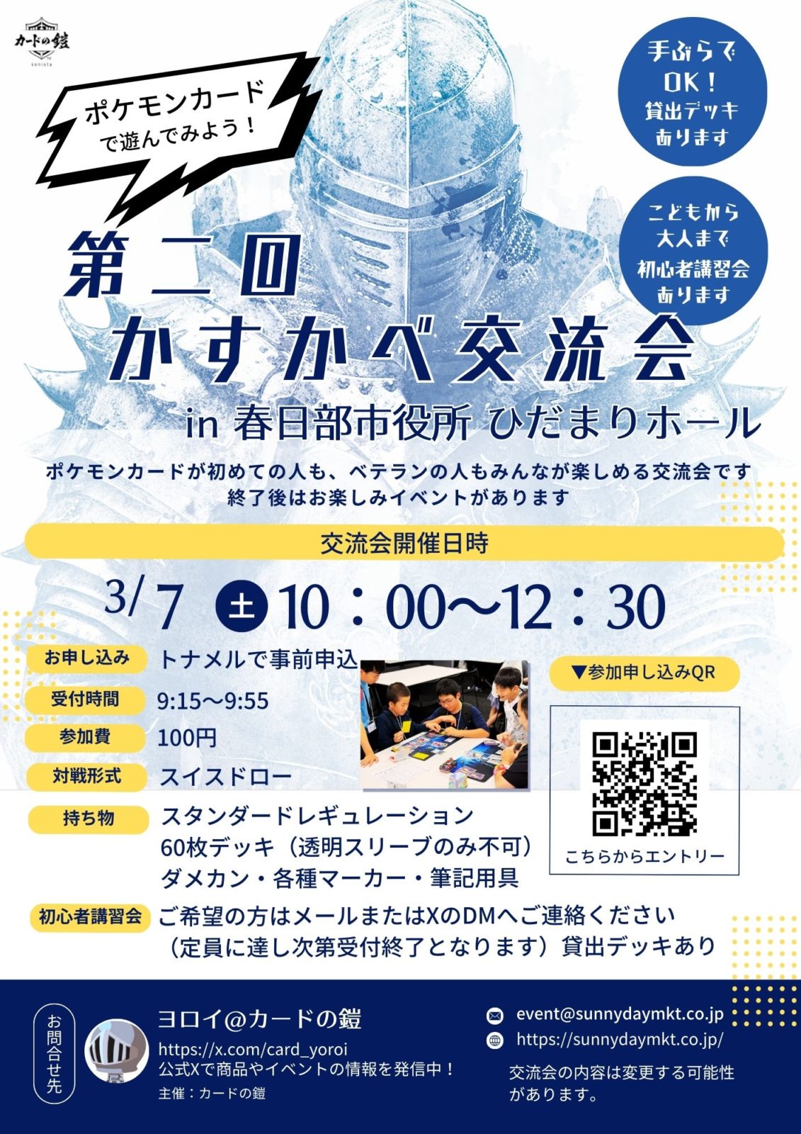 サニーデイマーケット/カードの鎧™は、2026年3月7日(土)に春日部市役所 ひだまりホールにて、トレーディングカードゲーム「ポケモンカード」を通じた交流イベント「かすかべ交流会」を開催します。